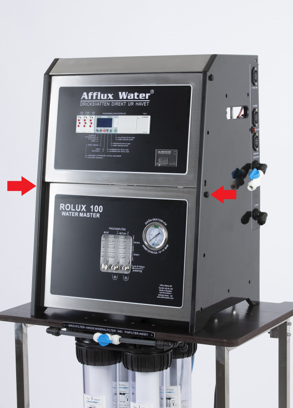 UV-enhet Om låsskruvar i sidogavlar tas bort, kan undre front panelen vikas fram för åtkomst till UV-enheten.